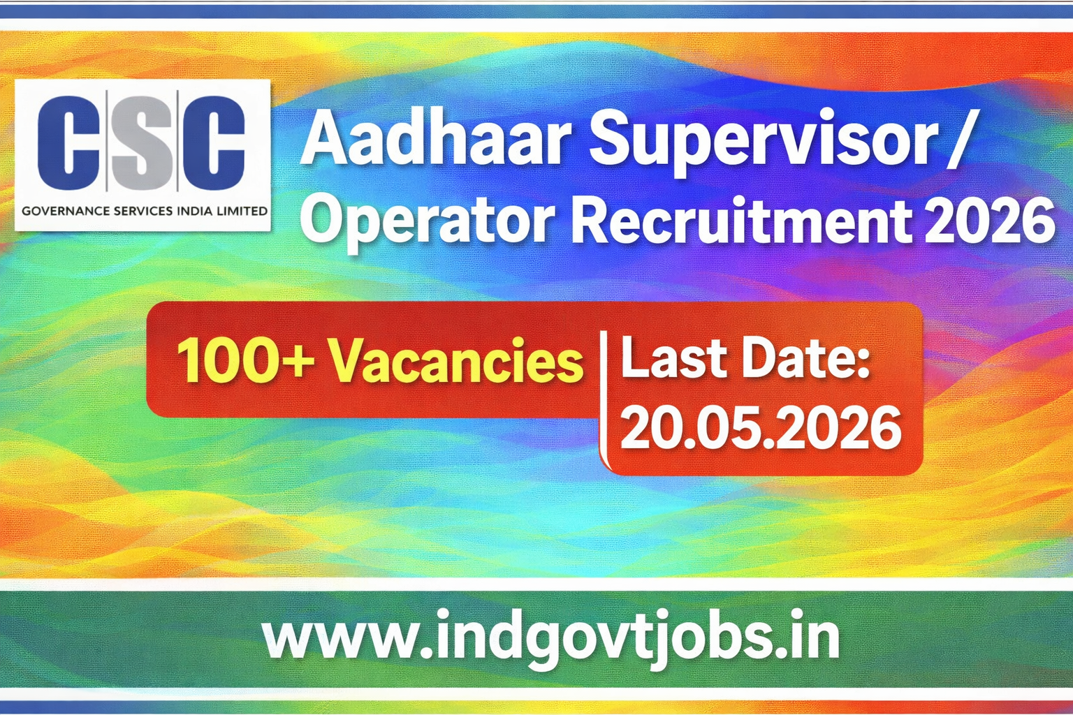Common Services Centre (CSC) e-Governance Services India Limited, has released a notification for the CSC Aadhaar Supervisor/Operator Recruitment 2026. Online applications are invited to fill 100+ Aadhaar Supervisor / Operator vacancies on contract basis (one year) across various districts in India. Eligible candidates possessing Aadhaar Operator/Supervisor certification can apply online. The CSC online application is open and the last date for submission is 20 May 2026. Candidates must check the complete details regarding eligibility, age limit, remuneration, qualification, and the application process for the CSC Aadhaar Supervisor/Operator Posts Recruitment 2026 provided below.