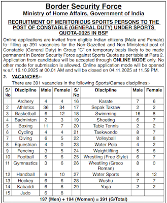 The Border Security Force (BSF), under the Ministry of Home Affairs, Government of India, has released the official notification for Constable (General Duty) under Sports Quota Recruitment 2025-26. Applications are invited online from eligible meritorious sports persons who have represented India in International Sports Events or won medals in National Championships for filling 391 vacancies … Read more