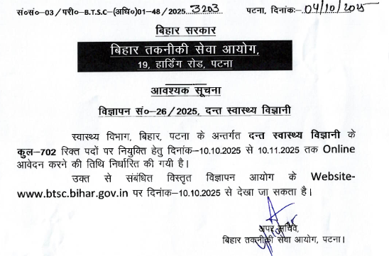 BTSC Dental Hygienist Recruitment 2025 Apply Online 702 Vacancies | Last Date 10th November A K Geherwal / October 6, 2025