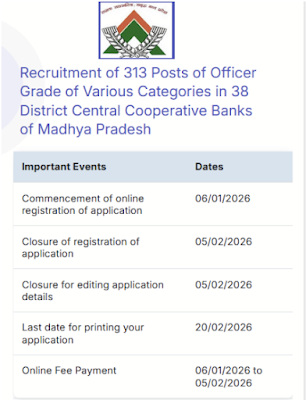 MP Rajya Sahakari Bank Maryadit (Apex Bank), Madhya Pradesh, has released the notification for recruitment to 313 Officer Grade posts in various cadres across 38 District Central Cooperative Banks (DCCBs). Eligible Indian citizens can apply online through the IBPS portal from 06 January 2026 to 05 February 2026. The Candidates are strongly advised to carefully … Read more