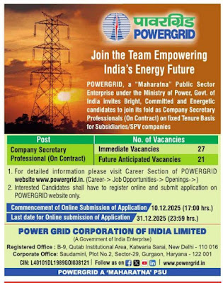 POWERGRID, a Maharatna Public Sector Enterprise under the Ministry of Power, Government of India, has announced the recruitment of 48 Company Secretary Professionals on Fixed Tenure Basis (Contract) for its subsidiaries/SPV companies. Eligible candidates who are Associate Members of ICSI with at least 1 year of relevant experience can apply online from 10th December 2025 … Read more
