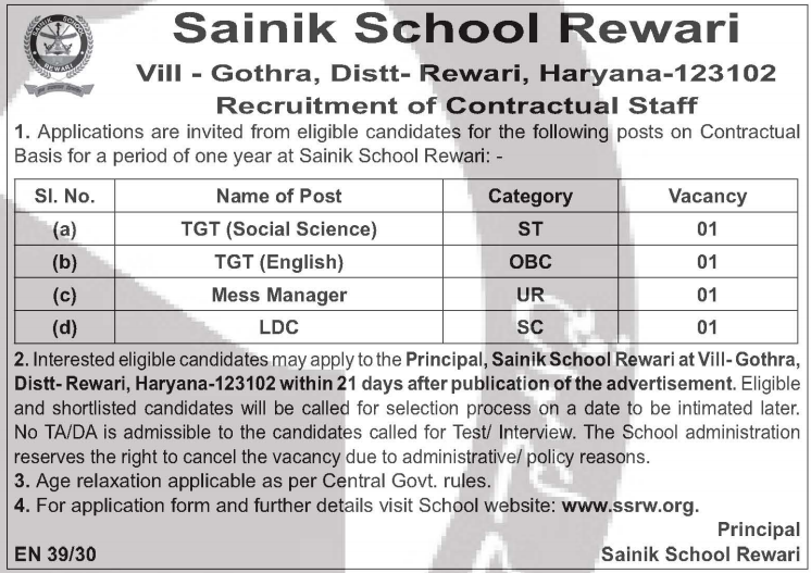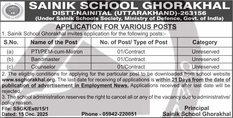 Sainik School Rewari, located at Village Gothra, District Rewari (Haryana), under the Sainik Schools Society, Ministry of Defence, has invited applications for contractual positions on a one-year basis. Eligible candidates can submit their offline applications in the prescribed format for these teaching and non-teaching roles. Aspirants are advised to carefully read the official Sainik School … Read more