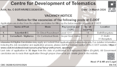 Centre for Development of Telematics (C-DOT), a premier Research & Development organisation under the Ministry of Communications, Government of India, has invited online applications for the recruitment of 14 Scientist B/C and 02 Consultant – Vigilance posts. The last date to submit the online application is 03rd May 2026.