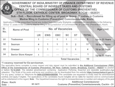 19 posts across Tradesman (03), Seaman (11), Greaser (04), and Senior Store Keeper (01) in Customs Marine Wing, Cochin.