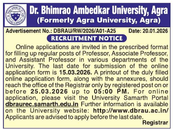 Dr. Bhimrao Ambedkar University (DBRAU), Agra invites online applications from eligible Indian nationals for recruitment to the posts of Professor, Associate Professor, and Assistant Professor in various subjects/ departments on regular basis. The DBRAU Faculty Recruitment 2026 for total 53 Vacancies. Online Application starts from 23rd January 2026 and closes on 15th March 2026. Hard copy submission last date is 25th March 2026.