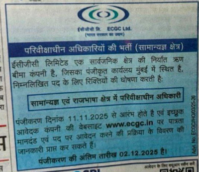 The ECGC PO Online Application Form 2025-26 will be available from 11th November 2025 to 2nd December 2025. Candidates must carefully read the detailed ECGC notification before applying.