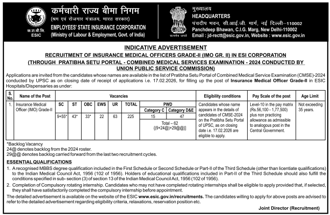 EMPLOYEES’ STATE INSURANCE CORPORATION (ESIC) invites applications from eligible candidates whose names appear in the list of Combined Medical Services Examination (CMSE)-2024 on the Pratibha Setu Portal of UPSC as on the closing date, for appointment to 225 posts of Insurance Medical Officer (IMO) Grade-II (Allopathic) in ESIC Hospitals/Dispensaries. The ESIC IMO Grade-II Recruitment 2026 Application Form in the prescribed format along with documents must be sent by Speed Post only.