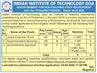 Indian Institute of Technology Goa (IIT Goa), an Institute of National Importance established by an Act of Parliament in the year 2016 to provide education and promote research in various branches of Engineering, Sciences & Technology, has invited online applications from eligible Indian Nationals for recruitment of 5 Non-Teaching Staff posts (Junior Engineer (Civil), Superintendent (Nursing) and Administrative Assistant) on a regular basis.