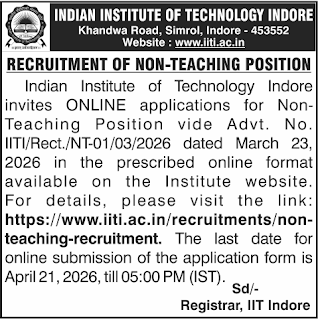 Eligible candidates are strongly advised to carefully read the detailed official notification before applying online to confirm eligibility regarding age, qualification, experience, category, reservation, and other criteria. The IIT Indore Deputy System Manager Recruitment 2026 for 1 Vacancy Online Registration process notification issued on 23rd March 2026 and the last date for online application is 21st April 2026 (up to 17:00 hrs).