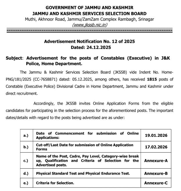 The Jammu and Kashmir Services Selection Board (JKSSB) has released Advertisement Notification No. 12 of 2025 inviting online applications from eligible candidates domiciled in the Union Territory of Jammu & Kashmir for the recruitment of 1815 Constable (Executive) posts in J&K Police under the Home Department.