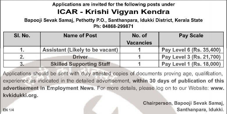 ICAR – Krishi Vigyan Kendra (KVK) Idukki District, Kerala under Indian Council of Agricultural Research (ICAR), Ministry of Agriculture and Farmers Welfare, Government of India, has invited applications for direct recruitment to 03 posts of Assistant, Driver and Skilled Support Staff on a regular basis.