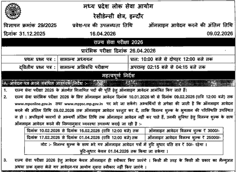 The Candidates are strongly advised to carefully read the detailed MPPSC State Service Exam 2026 notification before applying to confirm eligibility regarding age, qualification, category, and other criteria.