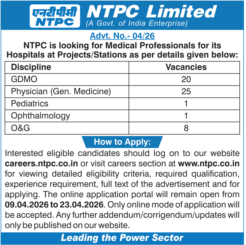 NTPC Limited, a Maharatna Company under the Government of India, has released a notification for the NTPC Medical Professional Recruitment 2026 (Advt. No. 04/26). This recruitment drive will be conducted to fill 55 Medical Professional vacancies for its hospitals at various Projects/Stations across India. The online application has started from 09 April 2026, and eligible candidates can apply until 23 April 2026.