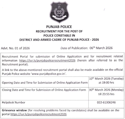 Eligible candidates are strongly advised to carefully read the detailed official notification before applying online to confirm eligibility regarding age, educational qualification, physical standards, Punjabi language requirement, category, and other criteria. The Punjab Police Constable Recruitment 2026 offers 3298 vacancies (1084 reserved for Women). Online registration opens on 10th March 2026 and closes on 30th March 2026.