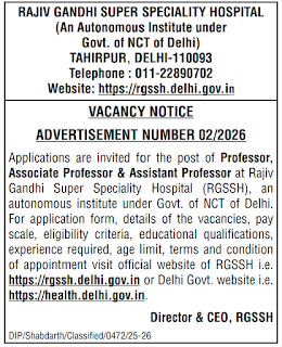 Rajiv Gandhi Super Speciality Hospital (RGSSH), Delhi, a premier Government of NCT of Delhi super-specialty hospital, has invited applications for recruitment of 43 Faculty posts – Professor, Associate Professor and Assistant Professor in various super-specialty departments on contract basis.