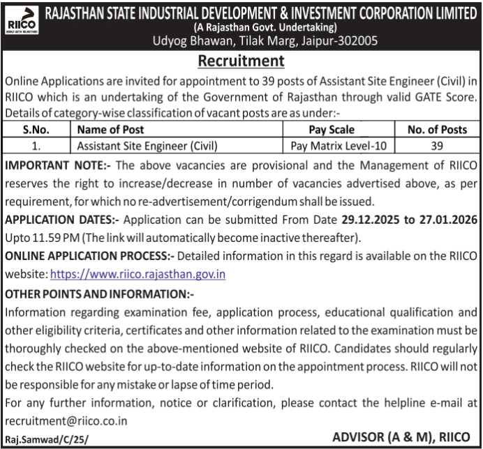 The Rajasthan State Industrial Development and Investment Corporation Limited (RIICO), a premier undertaking of the Government of Rajasthan, has invited online applications for direct recruitment to 39 posts of Assistant Site Engineer (Civil) based on valid GATE scores in Civil Engineering. This is an excellent opportunity for qualified civil engineers seeking stable government sector jobs in Rajasthan.