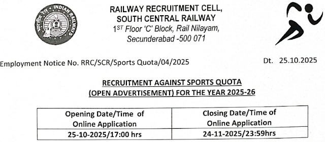 South Central Railway (SCR), Railway Recruitment Cell (RRC) Secunderabad, under the Ministry of Railways, Government of India, invites online applications from eligible Indian citizens for recruitment of 61 Group ‘C’ posts under Sports Quota through Open Advertisement for the year 2025-26 in various divisions of SCR. This opportunity is for sportspersons who have excelled in national/international levels in specified games to join the railway family.