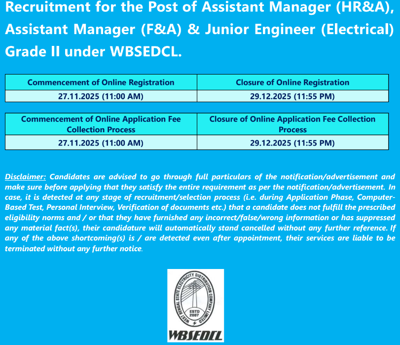 West Bengal State Electricity Distribution Company Limited (WBSEDCL) has released Notification No. MPP/2025/04 for recruitment to 447 posts of Assistant Manager (HR&A), Assistant Manager (F&A) and Junior Engineer (Electrical) Grade-II. Eligible candidates can apply online from 27th November 2025 to 29th December 2025. The Candidates are advised to read the detailed notification carefully before filling online application form.